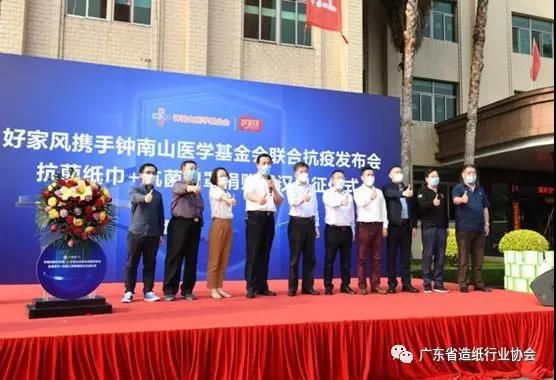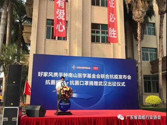 2020年3月1日下午,由广东省造纸行业协会副会长单位广东比伦生活用纸有限公司举办的“好家风携手钟南山医学基金会联合抗疫发布会暨抗菌纸巾+抗菌口罩捐赠武汉出征仪式”在广东比伦工厂大楼前召开。广东省造纸行业协会受邀出席了此次捐赠物资出征仪式。这是广东比伦旗下广东好家风新材料有限公司在本次疫情的第二次捐赠。此次好家风捐赠的物资,包含10万包“抗菌纸巾”和10万个“抗菌口罩”,捐赠物资价值120万元以上。 广东好家风新材料有限公司响应疫情的需要,在第一时间集结工人投入生产,于2月25日首批捐赠东莞一线医护人员5.8万包抗菌纸巾和5万个一次性医用口罩,目前已送达,并投入使用。广东省造纸行业协会副会长、中国首款抗菌干纸巾联合发明人、广东好家风新材料有限公司董事长许亦南先生面对记者关于“2次捐赠”的提问时,许董事长首先感谢了各级政府领导对企业的支持,随后说到,“这次疫情的发生,让企业更需要与时俱进,立足自身产业优势,从更专业、创新的角度承担起‘抗疫’的社会责任,做真正有益于社会和人民、解决实际问题的好纸巾。两次的捐赠其实也没什么,我们能做什么就做什么,只要是人民需要,我们就做什么,这是好家风企业的宗旨!好家风有信心与大家共同打赢这一场全民阻击战疫!” 许董事长发言接收本次捐赠的是广东省钟南山医学基金会和广东省室内环境卫生行业协会,他们对企业的捐赠表达了谢意并颁发捐赠证书。为了保障捐赠物资高效安全到达武汉,好家风专门成立“好家风支援武汉物资捐赠队”,抽调企业精干人员统筹规划此次物资捐赠、交通运输等事宜。 车队整装待发随后,此次物资捐赠队负责人从好家风许董事长和钟南山医学基金会黄书记手上接过任务旗。在众人的嘱托下,4辆大货车浩浩荡荡从厂区大门驶出,奔赴千里武汉。 据悉,本次捐赠的抗菌纸巾是由华南理工大学与广东比伦生活用纸公司(好家风)联合研发,此项技术突破了“干纸也可消毒”这一核心难题,成为了武汉医院接收的重要防护物资。这项抗菌技术是抗疫期间重大抗菌科研成果,更是全民安全防护的重大福音。危难时刻,八方支援,捐赠物资千里驰援武汉,守望相助、心手相牵,共同战“疫”!