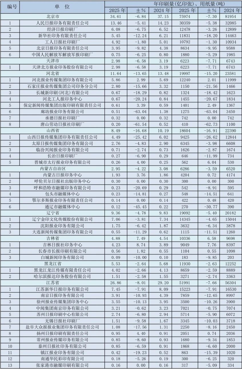 中国报业协会印刷工作委员会近日公布了2025年全国报纸印刷量和用纸量调查统计报告,这次调查有中央级、省级和市级报纸印刷单位共128家单位参加。这128家单位2025年的报纸印刷总量是326.69亿对开印张,用纸量是672535吨;2024年的报纸印刷总量是346.66亿对开印张,用纸量是715819吨。与2024年相比,2025年印刷量下降5.76%,用纸量下降6.05%,总体上保持平稳。