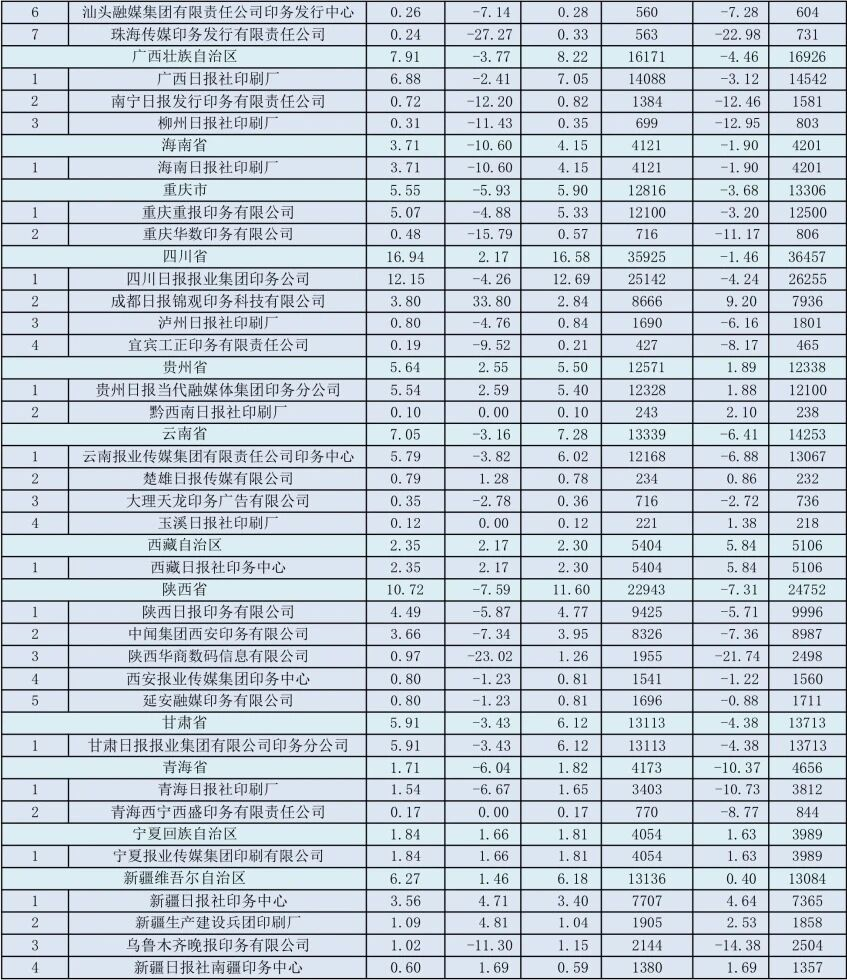 今年的报纸印刷量调查统计报告,按各单位的年印刷量大小顺序列表,并分别列出各省(自治区、直辖市)的汇总表。从全国各省(自治区、直辖市)报纸年印刷量的情况来看,北京、江苏、浙江、广东的印刷量较大,吉林、上海、西藏、四川、贵州的印刷量增加,山西、河北、湖南的印刷量下降幅度较大。中央党报、各部委行业报、各省级报纸仍然是报纸发行的主力军。