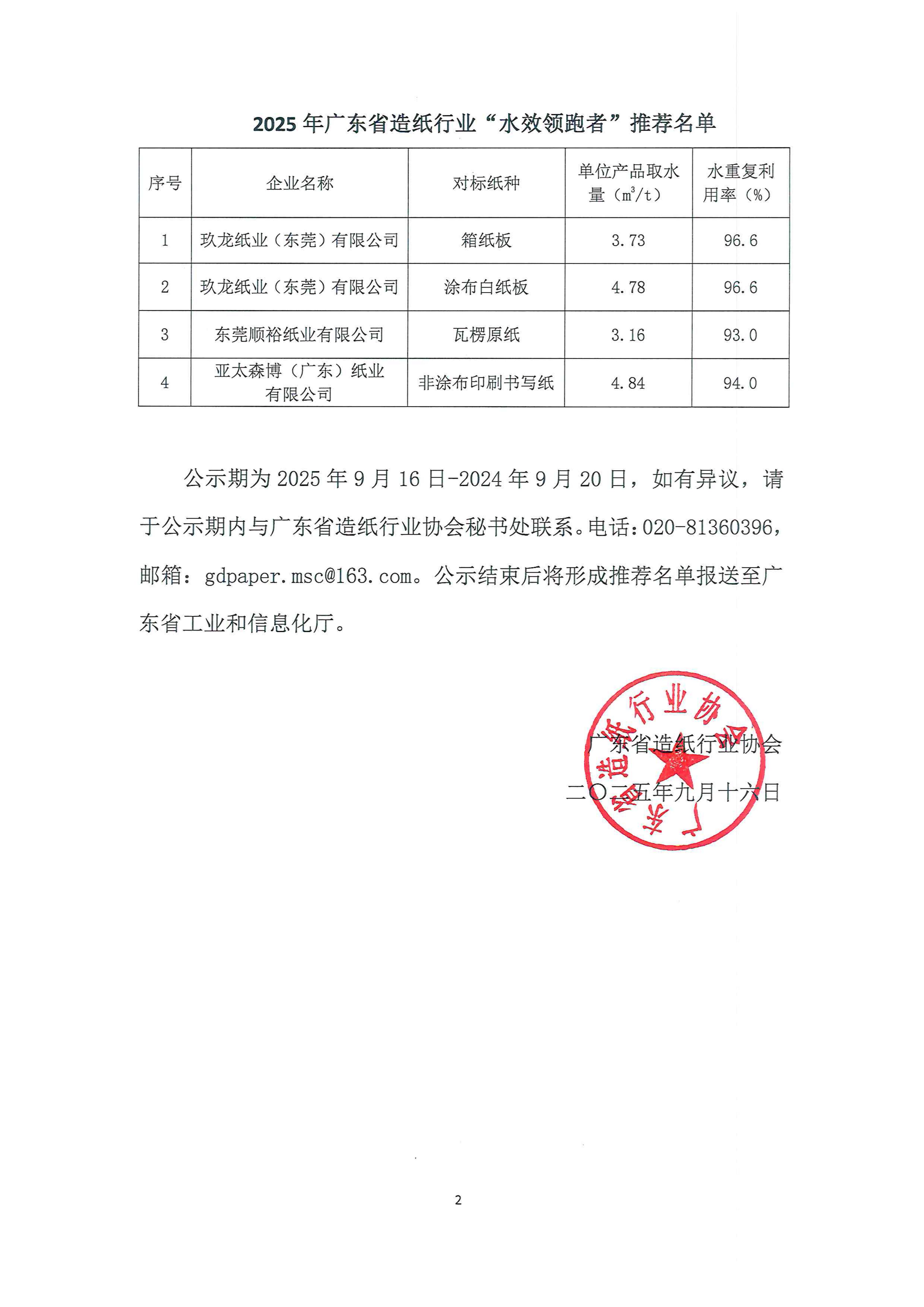 关于2025年广东省造纸行业“能效领跑者”、“水效领跑者”推荐名单的公示