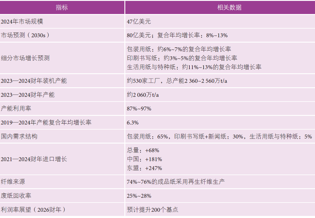 在识字率提升、城市化进程加快、卫生意识增强和包装需求扩大的驱动下,印度纸业市场预计可于2030 年初达到80 亿美元规模。