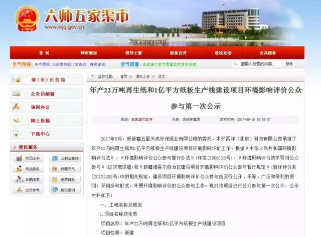 近日,新疆五家渠政府网站公布了2017年8月,新疆五星天成环保纸业有限公司的年产22万吨再生纸和1亿平方纸板生产线建设项目环境影响评价公示。