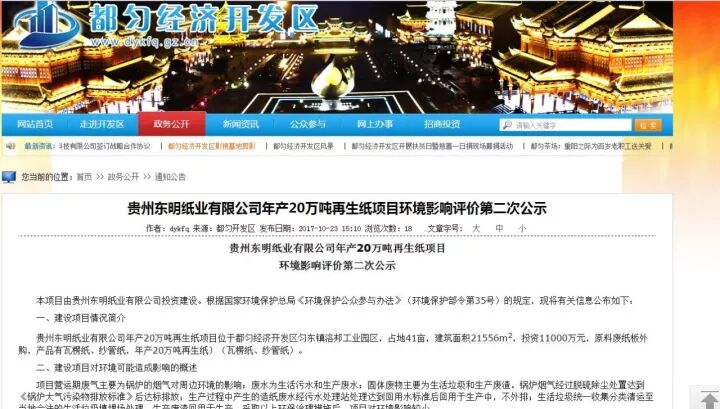 近日,在贵州都匀经济开发区匀东镇洛邦工业园区贵州东明纸业有限公司投资建设年产20万吨再生纸项目正进行第二次环境影响评价公示。