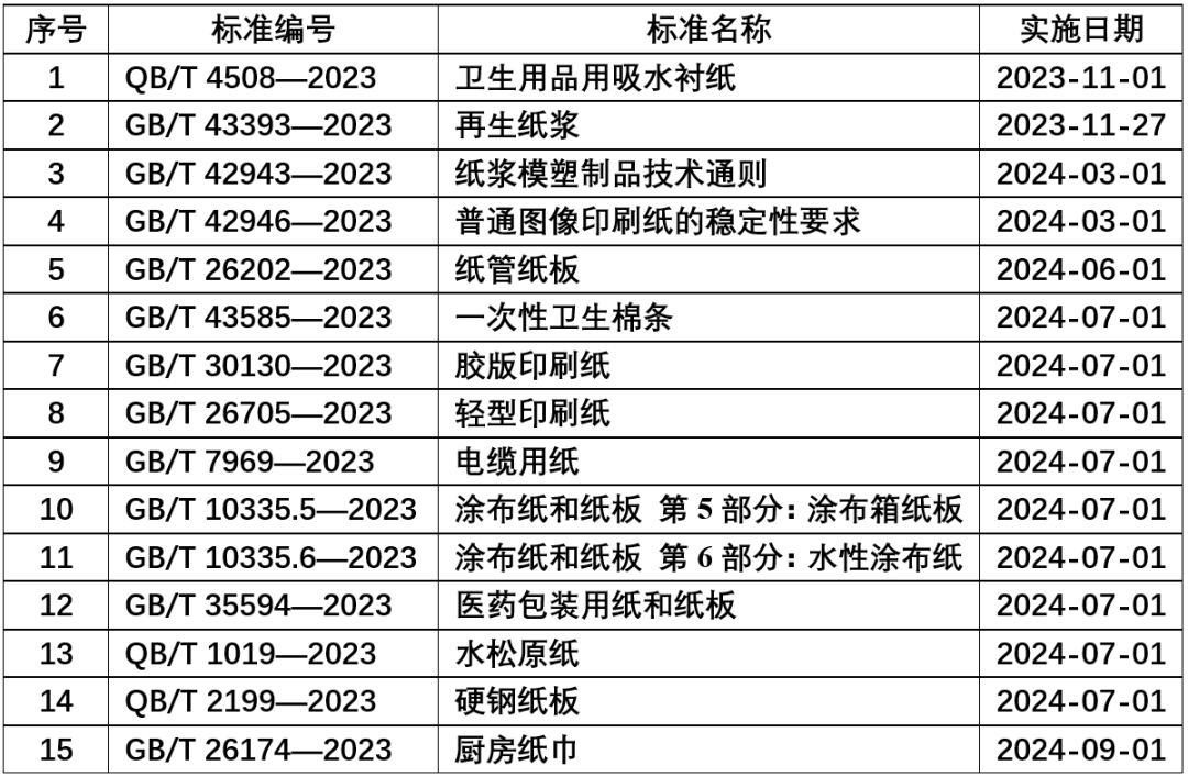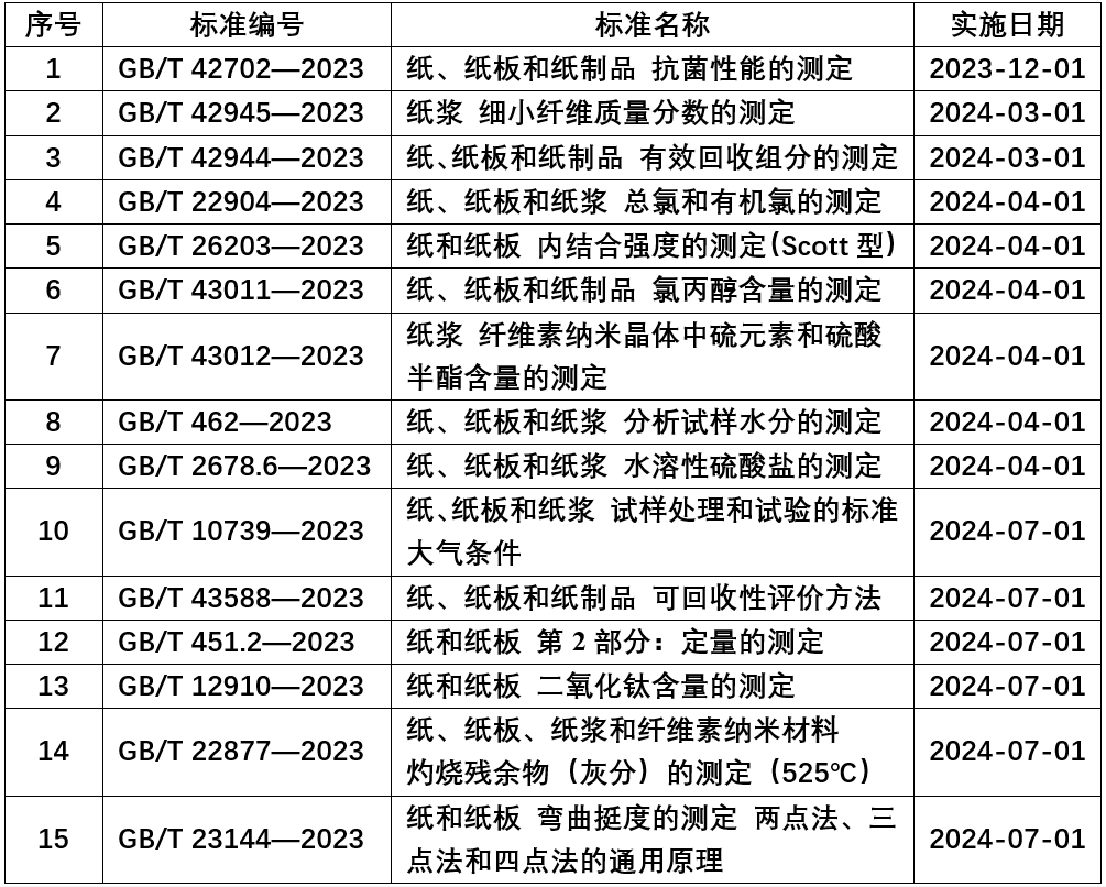 新发布的15项测定方法标准包括纸品检测标准大气条件、可回收性评价、抗菌性能和有害物质的测定方法等,请相关单位及时采用和实施新标准。