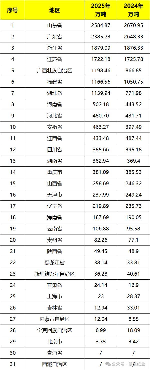 以下为全国31个省、自治区和直辖市数据,除西藏和青海外,其余29个地区均有规模以上造纸企业生产。