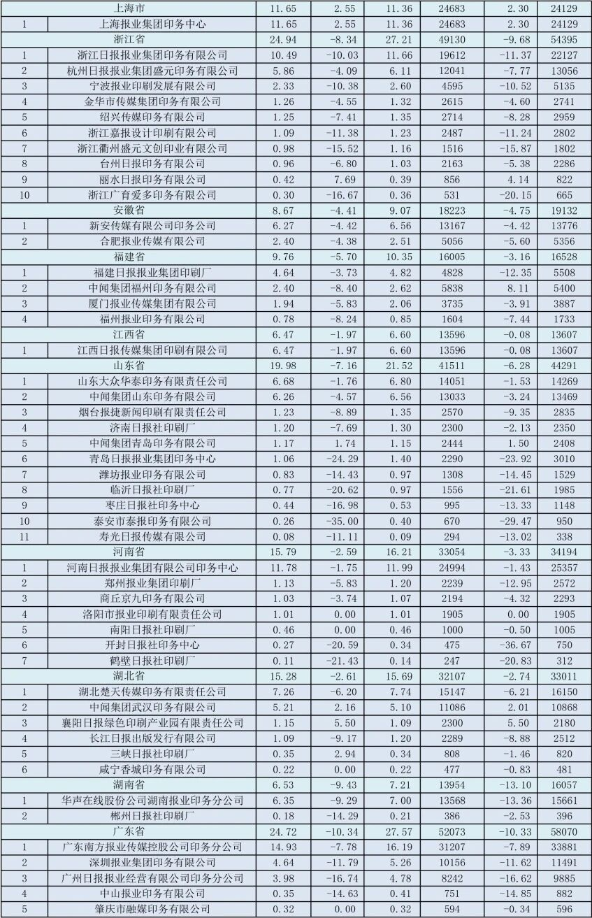 今年的报纸印刷量调查统计报告,按各单位的年印刷量大小顺序列表,并分别列出各省(自治区、直辖市)的汇总表。从全国各省(自治区、直辖市)报纸年印刷量的情况来看,北京、江苏、浙江、广东的印刷量较大,吉林、上海、西藏、四川、贵州的印刷量增加,山西、河北、湖南的印刷量下降幅度较大。中央党报、各部委行业报、各省级报纸仍然是报纸发行的主力军。