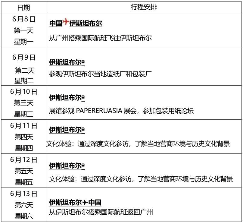 为助力我省造纸及相关企业开拓“一带一路”沿线市场,深入对接土耳其及欧亚区域的商业与产业资源,广东省造纸行业协会拟于2026年6月8-13日组织赴土耳其伊斯坦布尔的商务考察团。本次考察将结合参加“土耳其国际制浆造纸及一次性用品展”(Paper Eurasia),安排深度产业对接与文化商务活动,现将具体事宜通知如下: