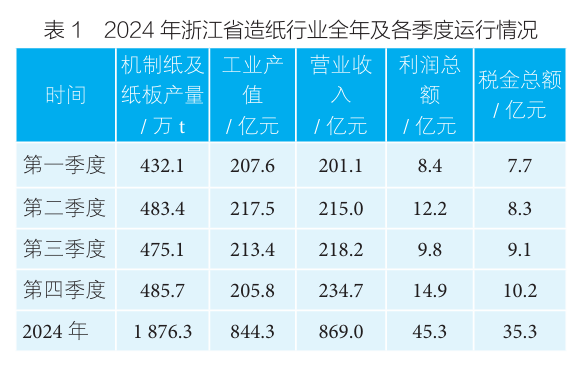 2024年浙江省造纸行业机制纸及纸板产量呈现波动上升趋势,全年累计达到1876.3万t,同比增长7.4%(见表1)。
