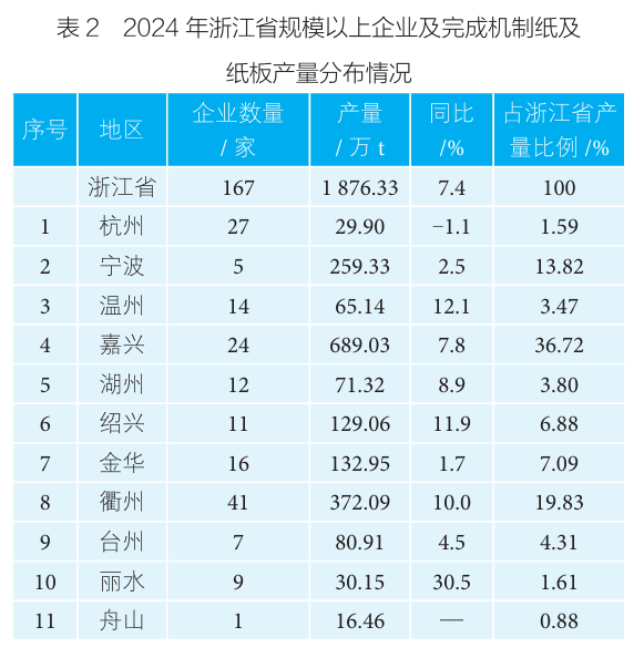 2024年,浙江省规模以上企业及完成机制纸及纸板产量分布情况见表2。