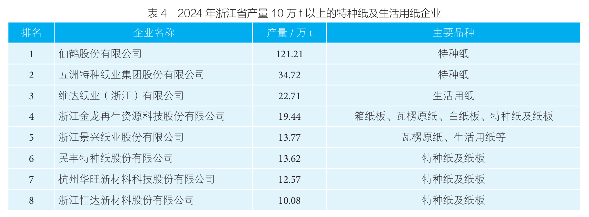 2024年,浙江省年产量10万t以上特种纸及生活 用纸企业排名见表4。