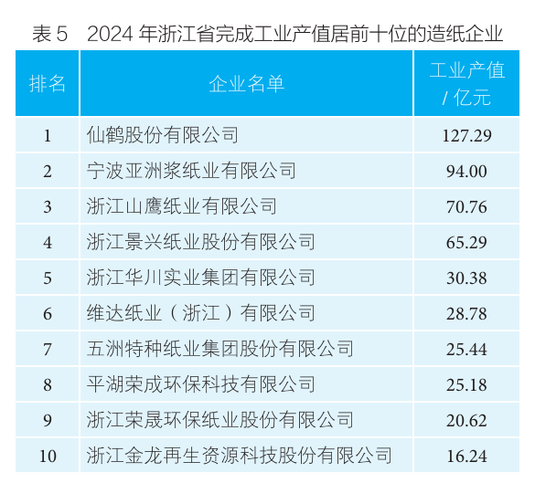 2024年,浙江省完成工业产值居前十位的造纸企业合计完成工业产值503.98亿元,占全省行业完成工业总产值59.69%(见表5)。浙江造纸业产值格局呈现“特种纸领跑、包装用纸规模效益不匹配、生活用纸突围”的三极态势,技术溢价(仙鹤股份、五洲特纸)与品类特性(维达纸业)成为突破规模限制的关键因素。