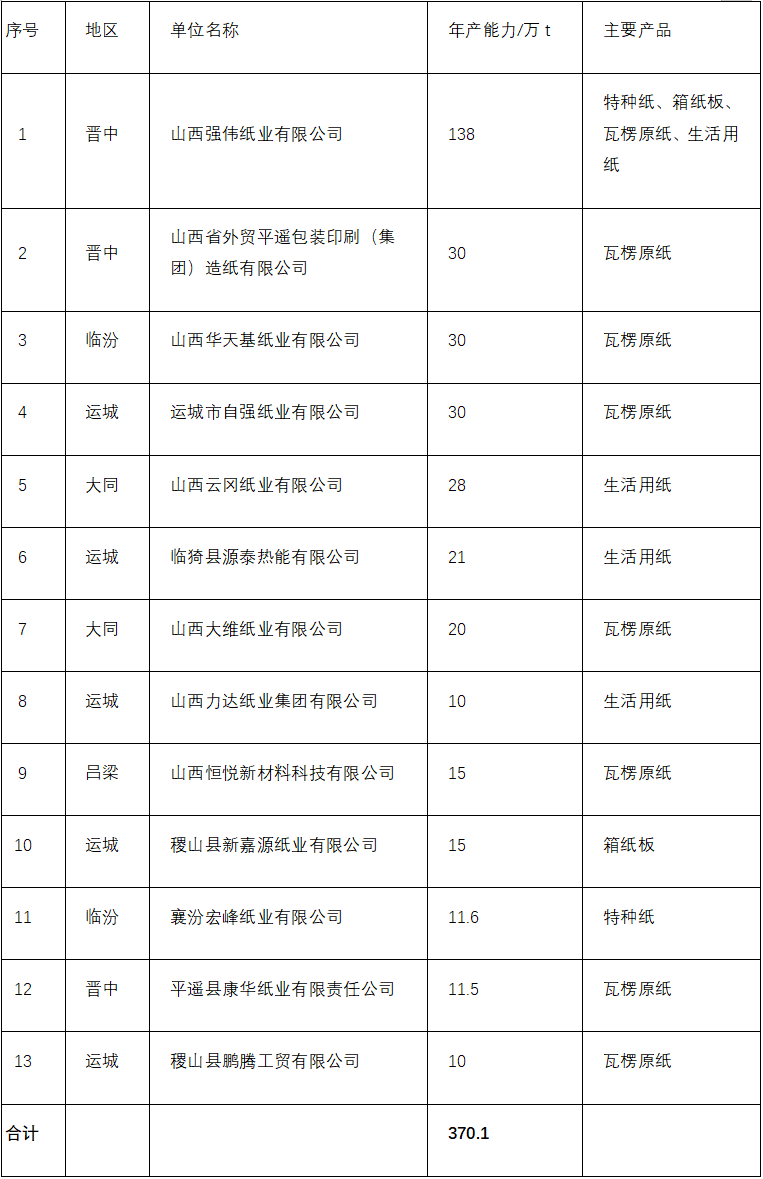 按造纸生产能力分类,山西省有1家大型(年产100万t以上)企业,中型(年产30万~100万t)的企业3家,年产10万~30万t的小型企业9家,以上13家造纸企业合计产能370.1万t,占山西省机制纸及纸板总产能的88.9%,详见表1。